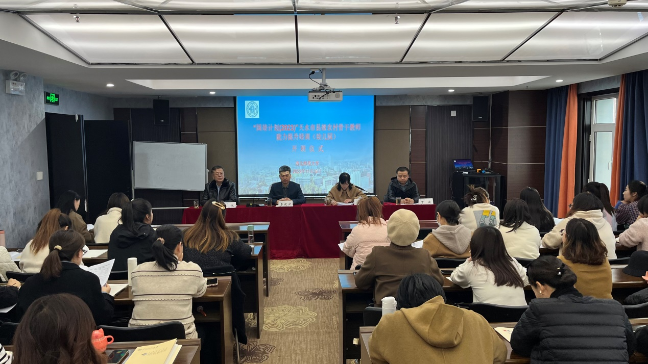 2023年11月16日上午,“国培计划(2023)”—天水市县级农村幼儿园骨干教师能力提升培训在西北师大顺利开班。3044am永利集团3044noc继续教育学院副院长李建升、天水市教育局教师工作科科长苏利出席开班仪式,学院培训中心相关负责人以及来自天水市100名县级农村幼儿园骨干教师参加仪式。